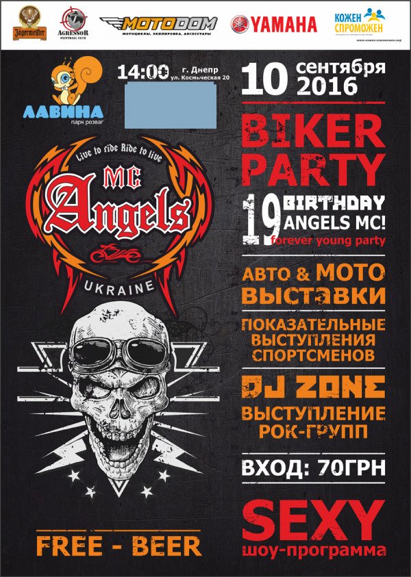 Biker Party состоится 10 сентября 2016, 14:00, суббота в Парк развлечений «Лавина». С помощью сервиса internet-bilet.ua, Вы сможете с легкостью забронировать, заказать и купить билеты на интересующий Вас концерт, спектакль, оперу, балет, мастер-классы, спортивные и детские мероприятия, оплатив их самым удобным для Вас способом: через интернет банковской картой VISA/MasterCard, наличными или курьером, если сделаете заказ билета c доставкой.