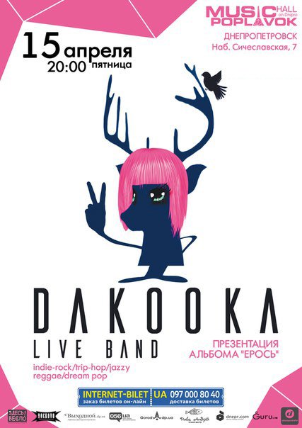DAKOOKA состоится 15 апреля 2016, 20:00, пятница в Poplavok Music Hall. С помощью сервиса internet-bilet.ua, Вы сможете с легкостью забронировать, заказать и купить билеты на интересующий Вас концерт, спектакль, оперу, балет, мастер-классы, спортивные и детские мероприятия, оплатив их самым удобным для Вас способом: через интернет банковской картой VISA/MasterCard, наличными или курьером, если сделаете заказ билета c доставкой.