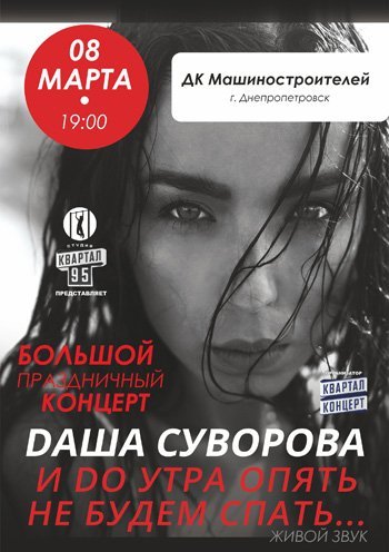 Даша Суворова состоится 8 марта 2015, 19:00, воскресенье в ДК Машиностроителей. С помощью сервиса internet-bilet.ua, Вы сможете с легкостью забронировать, заказать и купить билеты на интересующий Вас концерт, спектакль, оперу, балет, мастер-классы, спортивные и детские мероприятия, оплатив их самым удобным для Вас способом: через интернет банковской картой VISA/MasterCard, наличными или курьером, если сделаете заказ билета c доставкой.