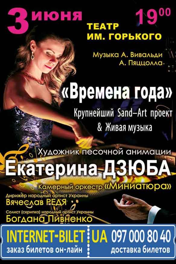 "Времена года" состоится 3 июня 2016, 19:00, пятница в Днепровский академический театр драмы и комедии. С помощью сервиса internet-bilet.ua, Вы сможете с легкостью забронировать, заказать и купить билеты на интересующий Вас концерт, спектакль, оперу, балет, мастер-классы, спортивные и детские мероприятия, оплатив их самым удобным для Вас способом: через интернет банковской картой VISA/MasterCard, наличными или курьером, если сделаете заказ билета c доставкой.