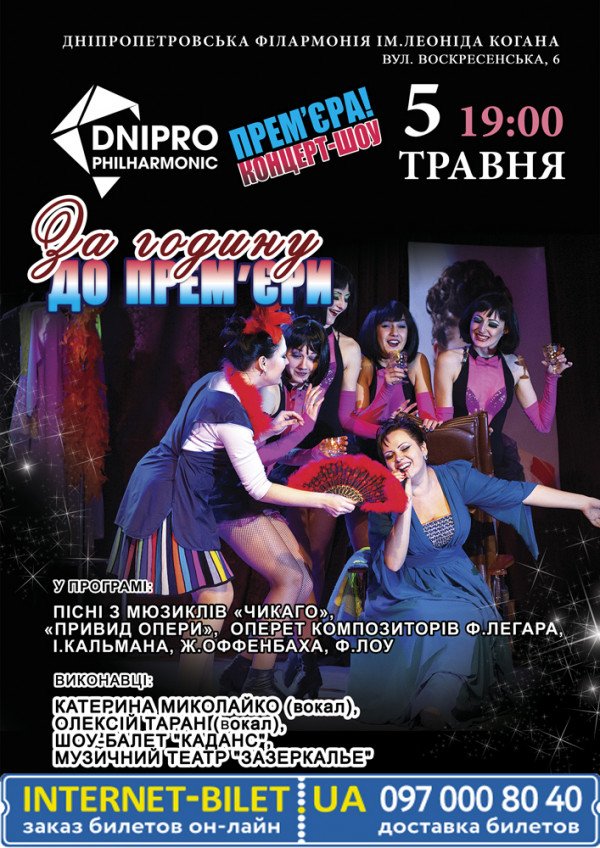 За годину до прем'єри состоится 5 мая 2016, 19:00, четверг в Днепропетровская филармония имени Л. Б. Когана. С помощью сервиса internet-bilet.ua, Вы сможете с легкостью забронировать, заказать и купить билеты на интересующий Вас концерт, спектакль, оперу, балет, мастер-классы, спортивные и детские мероприятия, оплатив их самым удобным для Вас способом: через интернет банковской картой VISA/MasterCard, наличными или курьером, если сделаете заказ билета c доставкой.