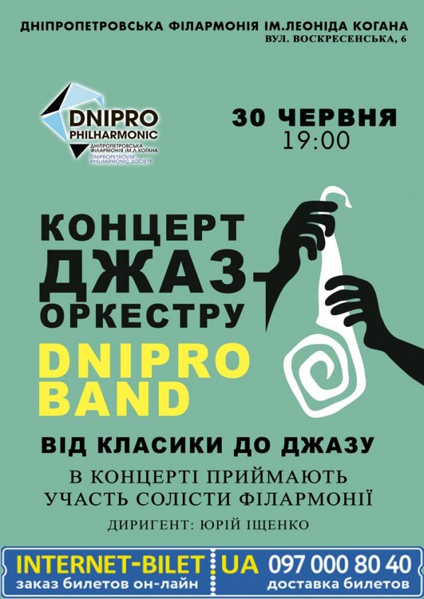 Концерт джаз-оркестра состоится 30 июня 2016, 19:00, четверг в Днепропетровская филармония имени Л. Б. Когана. С помощью сервиса internet-bilet.ua, Вы сможете с легкостью забронировать, заказать и купить билеты на интересующий Вас концерт, спектакль, оперу, балет, мастер-классы, спортивные и детские мероприятия, оплатив их самым удобным для Вас способом: через интернет банковской картой VISA/MasterCard, наличными или курьером, если сделаете заказ билета c доставкой.