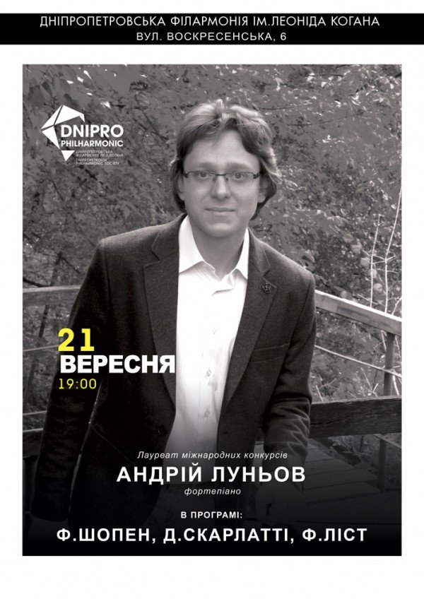 Лауреат международных конкурсов Андрей Лунев состоится 21 сентября 2016, 19:00, среда в Днепропетровская филармония имени Л. Б. Когана. С помощью сервиса internet-bilet.ua, Вы сможете с легкостью забронировать, заказать и купить билеты на интересующий Вас концерт, спектакль, оперу, балет, мастер-классы, спортивные и детские мероприятия, оплатив их самым удобным для Вас способом: через интернет банковской картой VISA/MasterCard, наличными или курьером, если сделаете заказ билета c доставкой.