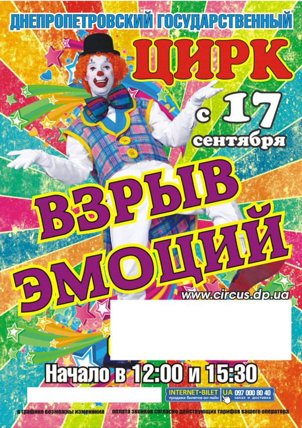 "Взрыв Эмоций" состоится 25 сентября 2016, 15:30, воскресенье в Днепровский цирк. С помощью сервиса internet-bilet.ua, Вы сможете с легкостью забронировать, заказать и купить билеты на интересующий Вас концерт, спектакль, оперу, балет, мастер-классы, спортивные и детские мероприятия, оплатив их самым удобным для Вас способом: через интернет банковской картой VISA/MasterCard, наличными или курьером, если сделаете заказ билета c доставкой.