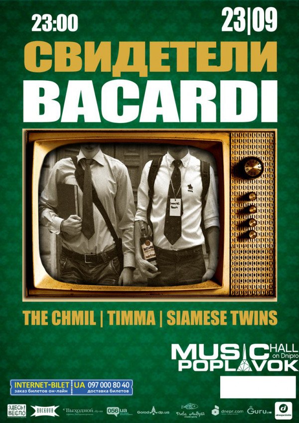 Cвидетели BACARDI состоится 23 сентября 2016, 23:00, пятница в Poplavok Music Hall. С помощью сервиса internet-bilet.ua, Вы сможете с легкостью забронировать, заказать и купить билеты на интересующий Вас концерт, спектакль, оперу, балет, мастер-классы, спортивные и детские мероприятия, оплатив их самым удобным для Вас способом: через интернет банковской картой VISA/MasterCard, наличными или курьером, если сделаете заказ билета c доставкой.