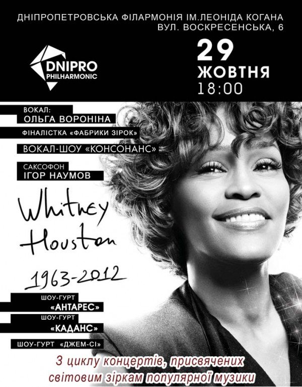 " Whitney Houston " состоится 29 октября 2016, 18:00, суббота в Днепропетровская филармония имени Л. Б. Когана. С помощью сервиса internet-bilet.ua, Вы сможете с легкостью забронировать, заказать и купить билеты на интересующий Вас концерт, спектакль, оперу, балет, мастер-классы, спортивные и детские мероприятия, оплатив их самым удобным для Вас способом: через интернет банковской картой VISA/MasterCard, наличными или курьером, если сделаете заказ билета c доставкой.