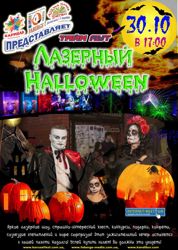 Лазерный Helloween состоится 30 октября 2016, 17:00, воскресенье в Тайм Аут. С помощью сервиса internet-bilet.ua, Вы сможете с легкостью забронировать, заказать и купить билеты на интересующий Вас концерт, спектакль, оперу, балет, мастер-классы, спортивные и детские мероприятия, оплатив их самым удобным для Вас способом: через интернет банковской картой VISA/MasterCard, наличными или курьером, если сделаете заказ билета c доставкой.