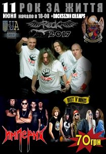 11 июня - Одни из лучших hard rock групп Украины ТОК, ИМПЕРИЯ, DUST N'BONES tribute to GUNS N'ROSES, а также победители фестиваля РОК СЕЗОН 2017 среди музыкальных групп и вокалистов в номинации лучший рок голос.