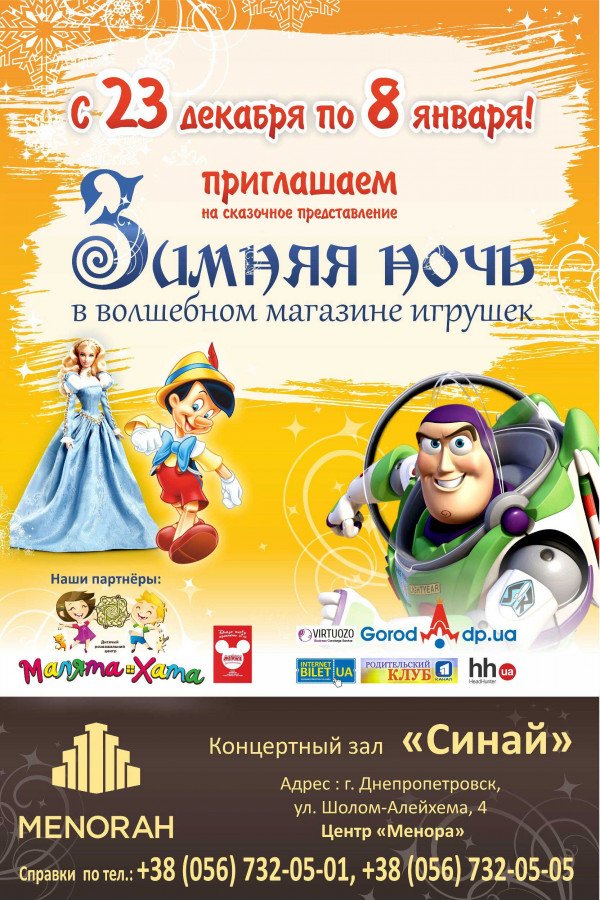 "Зимняя ночь в магазине игрушек" состоится 23 декабря 2012, 11:00, воскресенье в БЦ Менора, зал "Синай". С помощью сервиса internet-bilet.ua, Вы сможете с легкостью забронировать, заказать и купить билеты на интересующий Вас концерт, спектакль, оперу, балет, мастер-классы, спортивные и детские мероприятия, оплатив их самым удобным для Вас способом: через интернет банковской картой VISA/MasterCard, наличными или курьером, если сделаете заказ билета c доставкой.