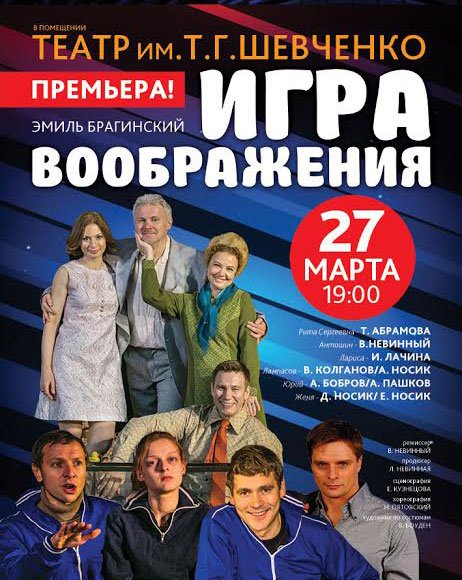 Игра воображения состоится 27 марта 2014, 19:00, четверг в Днепровский национальный академический украинский музыкально-драматический театр им. Т.Г. Шевченко. С помощью сервиса internet-bilet.ua, Вы сможете с легкостью забронировать, заказать и купить билеты на интересующий Вас концерт, спектакль, оперу, балет, мастер-классы, спортивные и детские мероприятия, оплатив их самым удобным для Вас способом: через интернет банковской картой VISA/MasterCard, наличными или курьером, если сделаете заказ билета c доставкой.