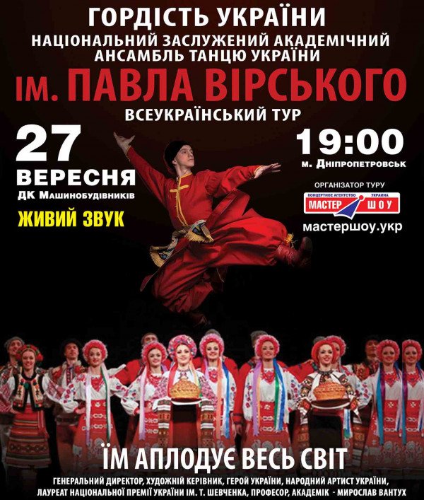Національний Заслужений Академічний Ансамбль ім. Павла Вірського состоится 27 сентября 2014, 19:00, суббота в ДК Машиностроителей. С помощью сервиса internet-bilet.ua, Вы сможете с легкостью забронировать, заказать и купить билеты на интересующий Вас концерт, спектакль, оперу, балет, мастер-классы, спортивные и детские мероприятия, оплатив их самым удобным для Вас способом: через интернет банковской картой VISA/MasterCard, наличными или курьером, если сделаете заказ билета c доставкой.