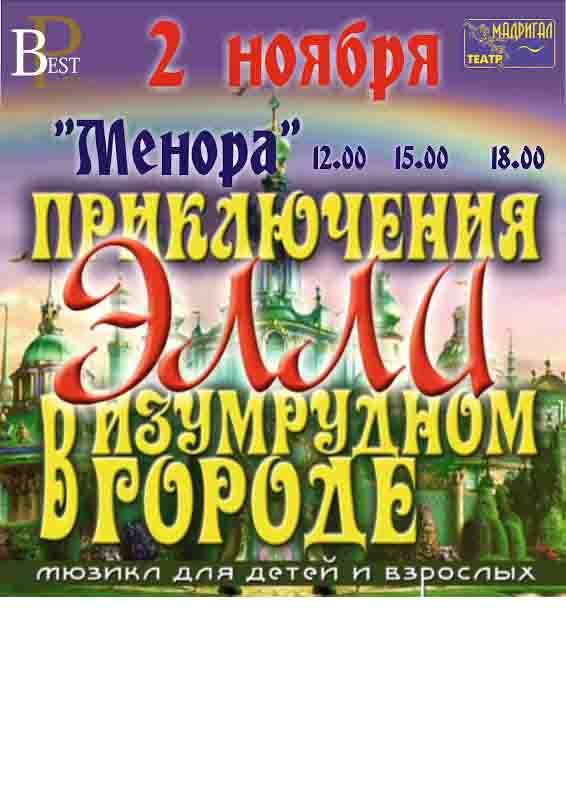 Event агентство «Best Party» представляет 2 ноября 2014 года, в концертном зале культурно-делового центра "Менора" , мюзикл для детей и взрослых "Элли в изумрудном городе", постановка молодёжного театра "Мадригал". Шикарные декорации, уникальные костюмы, современное техническое обеспечение. Время проведения 15.00 и 18.00. Мероприятие будет проходить в рамках благотворительной акции. Если у Вас есть желание и возможность, Вы можете купить и подарить билет не только своему ребенку, но и детям из детского дома-интерната г.Днепропетровска. Цена благотворительного билета 100 грн.