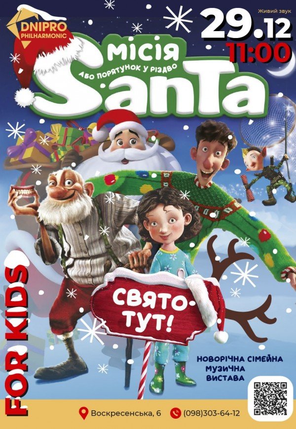 Інтерактивна вистава «Місія Санта або Порятунок у Різдво» состоится 29 декабря 2025, 11:00, понедельник в Днепропетровская филармония имени Л. Б. Когана. С помощью сервиса internet-bilet.ua, Вы сможете с легкостью забронировать, заказать и купить билеты на интересующий Вас концерт, спектакль, оперу, балет, мастер-классы, спортивные и детские мероприятия, оплатив их самым удобным для Вас способом: через интернет банковской картой VISA/MasterCard, наличными или курьером, если сделаете заказ билета c доставкой.