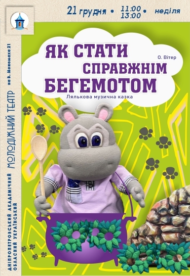 Спектакль «Как стать настоящим бегемотом» состоится 21 декабря 2025, 11:00, воскресенье в Днепропетровский академический молодежный театр. С помощью сервиса internet-bilet.ua, Вы сможете с легкостью забронировать, заказать и купить билеты на интересующий Вас концерт, спектакль, оперу, балет, мастер-классы, спортивные и детские мероприятия, оплатив их самым удобным для Вас способом: через интернет банковской картой VISA/MasterCard, наличными или курьером, если сделаете заказ билета c доставкой.