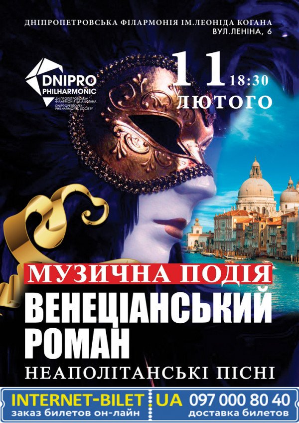 Музыкальное шоу "Венецианский роман" состоится 11 февраля 2016, 18:30, четверг в Днепропетровская филармония имени Л. Б. Когана. С помощью сервиса internet-bilet.ua, Вы сможете с легкостью забронировать, заказать и купить билеты на интересующий Вас концерт, спектакль, оперу, балет, мастер-классы, спортивные и детские мероприятия, оплатив их самым удобным для Вас способом: через интернет банковской картой VISA/MasterCard, наличными или курьером, если сделаете заказ билета c доставкой.