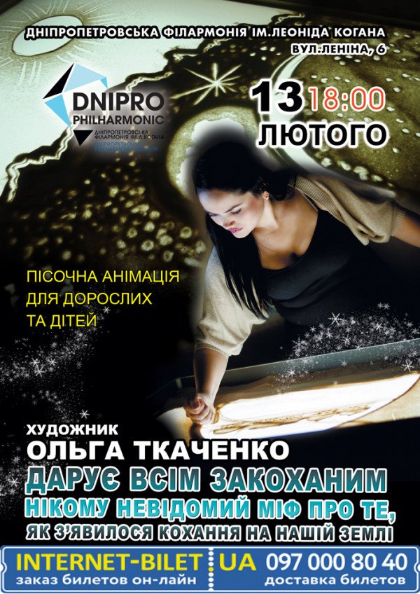 Песочная сказка «Миф о неземной любви» состоится 13 февраля 2016, 18:00, суббота в Днепропетровская филармония имени Л. Б. Когана. С помощью сервиса internet-bilet.ua, Вы сможете с легкостью забронировать, заказать и купить билеты на интересующий Вас концерт, спектакль, оперу, балет, мастер-классы, спортивные и детские мероприятия, оплатив их самым удобным для Вас способом: через интернет банковской картой VISA/MasterCard, наличными или курьером, если сделаете заказ билета c доставкой.