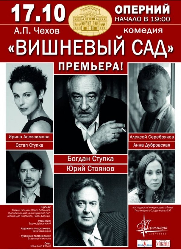 Вишневый сад состоится 17 октября 2011, 19:00, понедельник в Днепровский академический театр оперы и балета. С помощью сервиса internet-bilet.ua, Вы сможете с легкостью забронировать, заказать и купить билеты на интересующий Вас концерт, спектакль, оперу, балет, мастер-классы, спортивные и детские мероприятия, оплатив их самым удобным для Вас способом: через интернет банковской картой VISA/MasterCard, наличными или курьером, если сделаете заказ билета c доставкой.