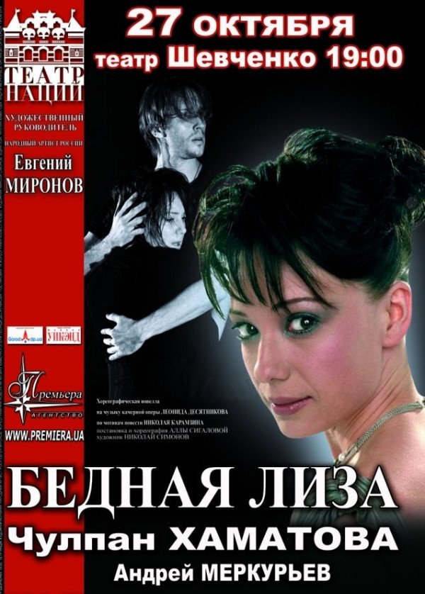 Бедная Лиза состоится 27 октября 2011, 19:00, четверг в Днепровский национальный академический украинский музыкально-драматический театр им. Т.Г. Шевченко. С помощью сервиса internet-bilet.ua, Вы сможете с легкостью забронировать, заказать и купить билеты на интересующий Вас концерт, спектакль, оперу, балет, мастер-классы, спортивные и детские мероприятия, оплатив их самым удобным для Вас способом: через интернет банковской картой VISA/MasterCard, наличными или курьером, если сделаете заказ билета c доставкой.
