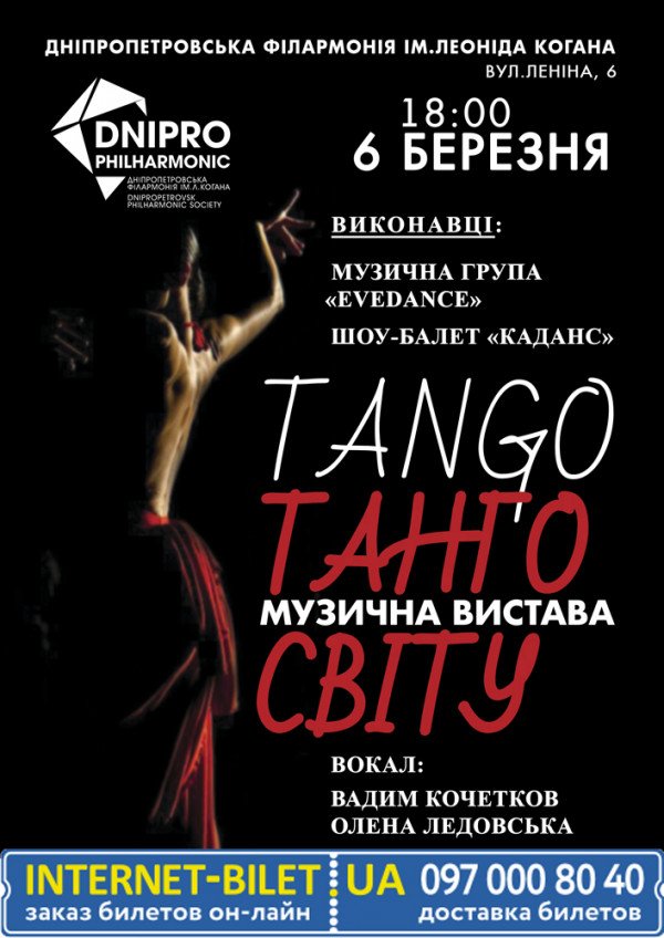 Танго мира состоится 6 марта 2016, 18:00, воскресенье в Днепропетровская филармония имени Л. Б. Когана. С помощью сервиса internet-bilet.ua, Вы сможете с легкостью забронировать, заказать и купить билеты на интересующий Вас концерт, спектакль, оперу, балет, мастер-классы, спортивные и детские мероприятия, оплатив их самым удобным для Вас способом: через интернет банковской картой VISA/MasterCard, наличными или курьером, если сделаете заказ билета c доставкой.