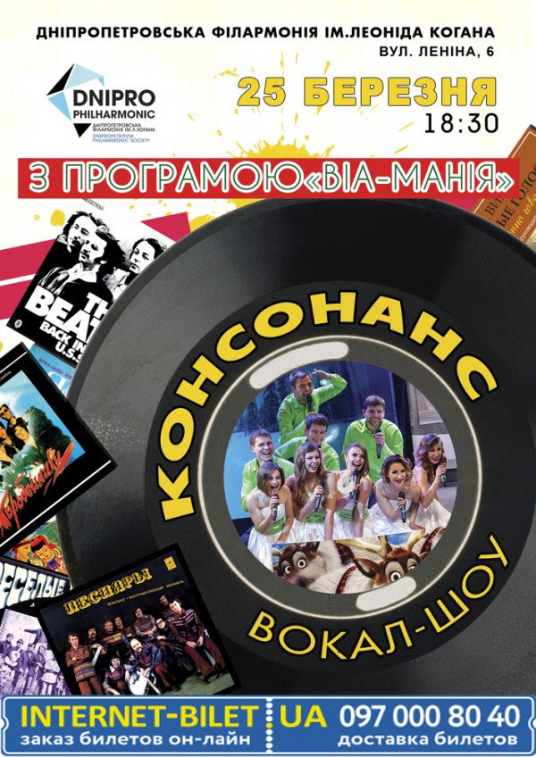 "ВИА-мания" состоится 25 марта 2016, 18:30, пятница в Днепропетровская филармония имени Л. Б. Когана. С помощью сервиса internet-bilet.ua, Вы сможете с легкостью забронировать, заказать и купить билеты на интересующий Вас концерт, спектакль, оперу, балет, мастер-классы, спортивные и детские мероприятия, оплатив их самым удобным для Вас способом: через интернет банковской картой VISA/MasterCard, наличными или курьером, если сделаете заказ билета c доставкой.