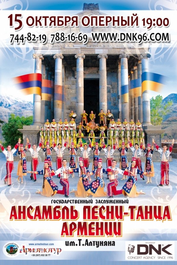 Ансамбль песни-танца Армении состоится 15 октября 2011, 19:00, суббота в Днепровский академический театр оперы и балета. С помощью сервиса internet-bilet.ua, Вы сможете с легкостью забронировать, заказать и купить билеты на интересующий Вас концерт, спектакль, оперу, балет, мастер-классы, спортивные и детские мероприятия, оплатив их самым удобным для Вас способом: через интернет банковской картой VISA/MasterCard, наличными или курьером, если сделаете заказ билета c доставкой.