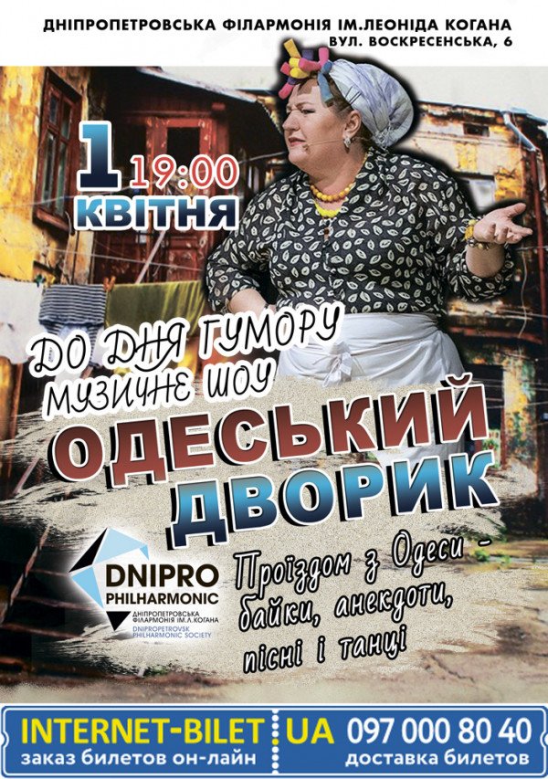 Одеський дворик состоится 1 апреля 2016, 19:00, пятница в Днепропетровская филармония имени Л. Б. Когана. С помощью сервиса internet-bilet.ua, Вы сможете с легкостью забронировать, заказать и купить билеты на интересующий Вас концерт, спектакль, оперу, балет, мастер-классы, спортивные и детские мероприятия, оплатив их самым удобным для Вас способом: через интернет банковской картой VISA/MasterCard, наличными или курьером, если сделаете заказ билета c доставкой.