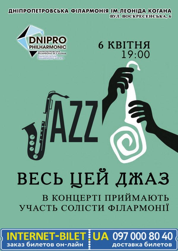Концерт джаз-оркестра состоится 6 апреля 2016, 19:00, среда в Днепропетровская филармония имени Л. Б. Когана. С помощью сервиса internet-bilet.ua, Вы сможете с легкостью забронировать, заказать и купить билеты на интересующий Вас концерт, спектакль, оперу, балет, мастер-классы, спортивные и детские мероприятия, оплатив их самым удобным для Вас способом: через интернет банковской картой VISA/MasterCard, наличными или курьером, если сделаете заказ билета c доставкой.