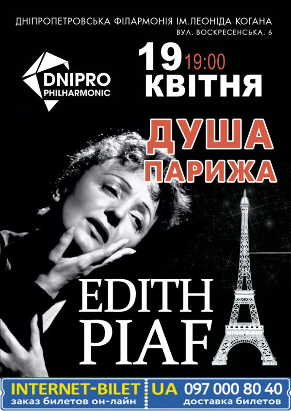 Душа Парижа состоится 19 апреля 2016, 19:00, вторник в Днепропетровская филармония имени Л. Б. Когана. С помощью сервиса internet-bilet.ua, Вы сможете с легкостью забронировать, заказать и купить билеты на интересующий Вас концерт, спектакль, оперу, балет, мастер-классы, спортивные и детские мероприятия, оплатив их самым удобным для Вас способом: через интернет банковской картой VISA/MasterCard, наличными или курьером, если сделаете заказ билета c доставкой.