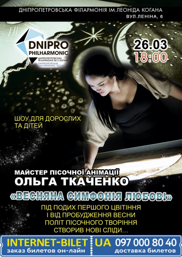 Весняна симфонія любові состоится 26 марта 2016, 18:00, суббота в Днепропетровская филармония имени Л. Б. Когана. С помощью сервиса internet-bilet.ua, Вы сможете с легкостью забронировать, заказать и купить билеты на интересующий Вас концерт, спектакль, оперу, балет, мастер-классы, спортивные и детские мероприятия, оплатив их самым удобным для Вас способом: через интернет банковской картой VISA/MasterCard, наличными или курьером, если сделаете заказ билета c доставкой.