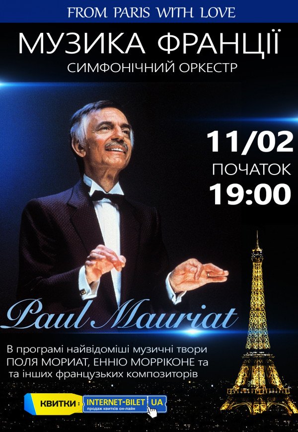 Вечер Французской музыки состоится 11 февраля 2019, 19:00, понедельник в Днепропетровская филармония имени Л. Б. Когана. С помощью сервиса internet-bilet.ua, Вы сможете с легкостью забронировать, заказать и купить билеты на интересующий Вас концерт, спектакль, оперу, балет, мастер-классы, спортивные и детские мероприятия, оплатив их самым удобным для Вас способом: через интернет банковской картой VISA/MasterCard, наличными или курьером, если сделаете заказ билета c доставкой.