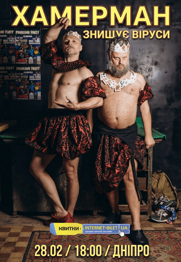 Хамерман Знищує Віруси состоится 28 февраля 2026, 18:00, суббота в Poplavok Music Hall. С помощью сервиса internet-bilet.ua, Вы сможете с легкостью забронировать, заказать и купить билеты на интересующий Вас концерт, спектакль, оперу, балет, мастер-классы, спортивные и детские мероприятия, оплатив их самым удобным для Вас способом: через интернет банковской картой VISA/MasterCard, наличными или курьером, если сделаете заказ билета c доставкой.