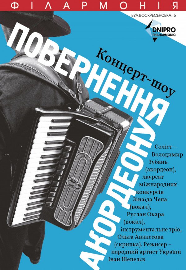 Концерт-шоу «Возвращение аккордеона» состоится 31 января 2018, 19:00, среда в Днепропетровская филармония имени Л. Б. Когана. С помощью сервиса internet-bilet.ua, Вы сможете с легкостью забронировать, заказать и купить билеты на интересующий Вас концерт, спектакль, оперу, балет, мастер-классы, спортивные и детские мероприятия, оплатив их самым удобным для Вас способом: через интернет банковской картой VISA/MasterCard, наличными или курьером, если сделаете заказ билета c доставкой.