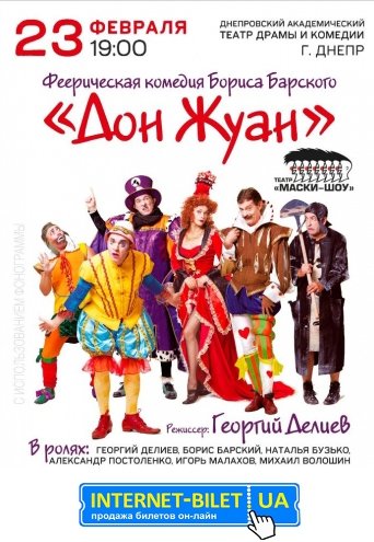 Маски-шоу. «Дон Жуан» состоится 23 февраля 2017, 19:00, четверг в Днепровский академический театр драмы и комедии. С помощью сервиса internet-bilet.ua, Вы сможете с легкостью забронировать, заказать и купить билеты на интересующий Вас концерт, спектакль, оперу, балет, мастер-классы, спортивные и детские мероприятия, оплатив их самым удобным для Вас способом: через интернет банковской картой VISA/MasterCard, наличными или курьером, если сделаете заказ билета c доставкой.