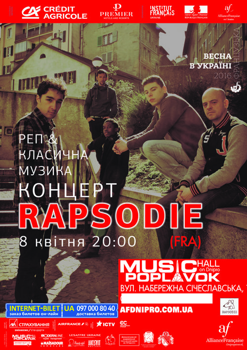 Rapsodie состоится 8 апреля 2016, 20:00, пятница в Poplavok Music Hall. С помощью сервиса internet-bilet.ua, Вы сможете с легкостью забронировать, заказать и купить билеты на интересующий Вас концерт, спектакль, оперу, балет, мастер-классы, спортивные и детские мероприятия, оплатив их самым удобным для Вас способом: через интернет банковской картой VISA/MasterCard, наличными или курьером, если сделаете заказ билета c доставкой.