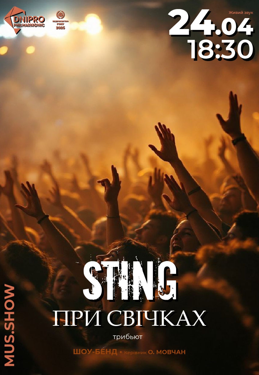 Концерт «Sting при свічках. Триб'ют» состоится 24 апреля 2026, 18:30, пятница в Днепропетровская филармония имени Л. Б. Когана. С помощью сервиса internet-bilet.ua, Вы сможете с легкостью забронировать, заказать и купить билеты на интересующий Вас концерт, спектакль, оперу, балет, мастер-классы, спортивные и детские мероприятия, оплатив их самым удобным для Вас способом: через интернет банковской картой VISA/MasterCard, наличными или курьером, если сделаете заказ билета c доставкой.