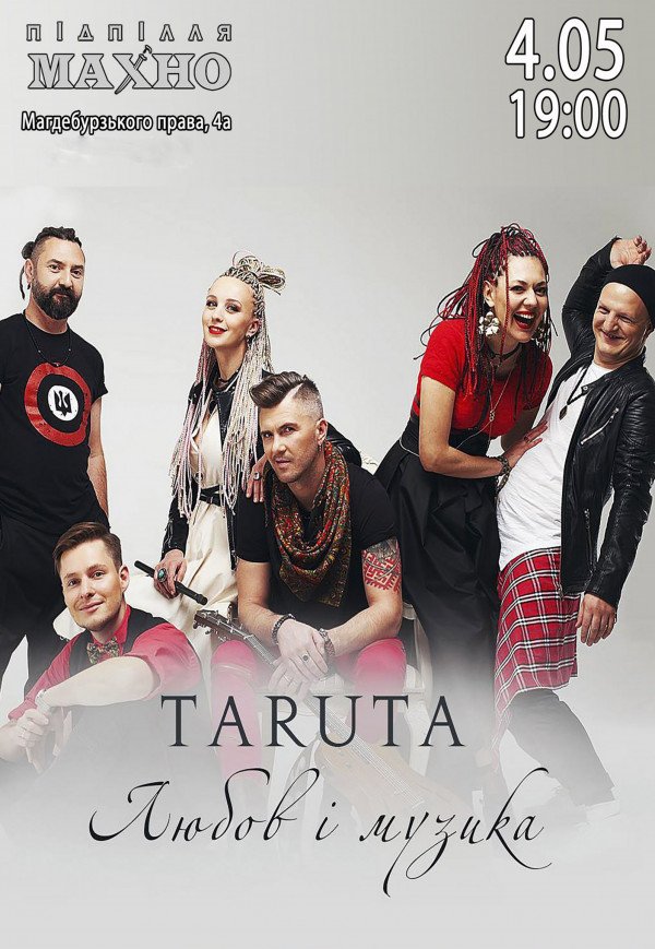 TaRuta состоится 4 мая 2018, 19:00, пятница в МахноПАБ. С помощью сервиса internet-bilet.ua, Вы сможете с легкостью забронировать, заказать и купить билеты на интересующий Вас концерт, спектакль, оперу, балет, мастер-классы, спортивные и детские мероприятия, оплатив их самым удобным для Вас способом: через интернет банковской картой VISA/MasterCard, наличными или курьером, если сделаете заказ билета c доставкой.
