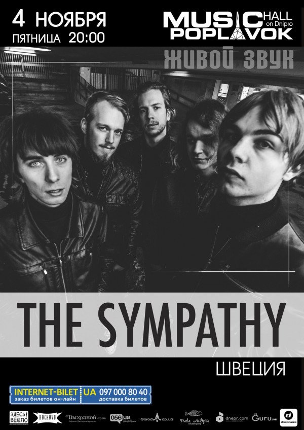 THE SYMPATHY состоится 4 ноября 2016, 20:00, пятница в Poplavok Music Hall. С помощью сервиса internet-bilet.ua, Вы сможете с легкостью забронировать, заказать и купить билеты на интересующий Вас концерт, спектакль, оперу, балет, мастер-классы, спортивные и детские мероприятия, оплатив их самым удобным для Вас способом: через интернет банковской картой VISA/MasterCard, наличными или курьером, если сделаете заказ билета c доставкой.
