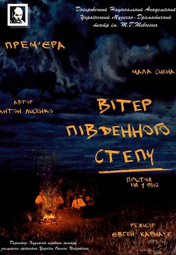 Спектакль «Ветер южной степи». Премьера! состоится 22 января 2026, 18:00, четверг в Днепровский национальный академический украинский музыкально-драматический театр им. Т.Г. Шевченко. С помощью сервиса internet-bilet.ua, Вы сможете с легкостью забронировать, заказать и купить билеты на интересующий Вас концерт, спектакль, оперу, балет, мастер-классы, спортивные и детские мероприятия, оплатив их самым удобным для Вас способом: через интернет банковской картой VISA/MasterCard, наличными или курьером, если сделаете заказ билета c доставкой.