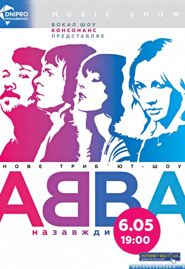 Вокал-шоу «Консонанс», триб'ют-шоу ABBA відбудеться 6 травня 2021, 19:00, четвер в Дніпропетровська філармонія імені Л. Б. Когана. За допомогою сервісу internet-bilet.ua, Ви зможете з легкістю забронювати, замовити та купити квитки на концерт, спектакль, оперу, балет, майстер-класи, спортивні та дитячі заходи, що Вас цікавлять, оплативши їх найбільш зручним для Вас способом: через інтернет банківською карткою VISA/MasterCard, готівкою або кур'єром, якщо зробите замовлення квитка з доставкою.