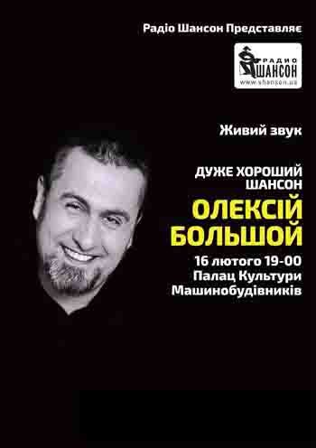 Алексей Большой відбудеться 16 лютого 2015, 19:00, понеділок в ПК Машинобудівників. За допомогою сервісу internet-bilet.ua, Ви зможете з легкістю забронювати, замовити та купити квитки на концерт, спектакль, оперу, балет, майстер-класи, спортивні та дитячі заходи, що Вас цікавлять, оплативши їх найбільш зручним для Вас способом: через інтернет банківською карткою VISA/MasterCard, готівкою або кур'єром, якщо зробите замовлення квитка з доставкою.