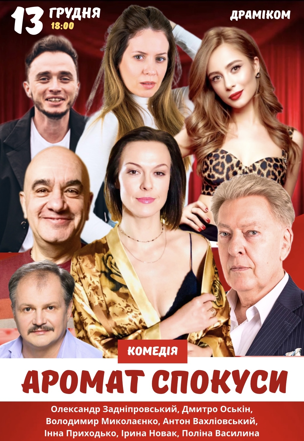 Вистава "Аромат спокуси" відбудеться 13 грудня 2025, 18:00, субота в Дніпровський академічний театр драми та комедії. За допомогою сервісу internet-bilet.ua, Ви зможете з легкістю забронювати, замовити та купити квитки на концерт, спектакль, оперу, балет, майстер-класи, спортивні та дитячі заходи, що Вас цікавлять, оплативши їх найбільш зручним для Вас способом: через інтернет банківською карткою VISA/MasterCard, готівкою або кур'єром, якщо зробите замовлення квитка з доставкою.