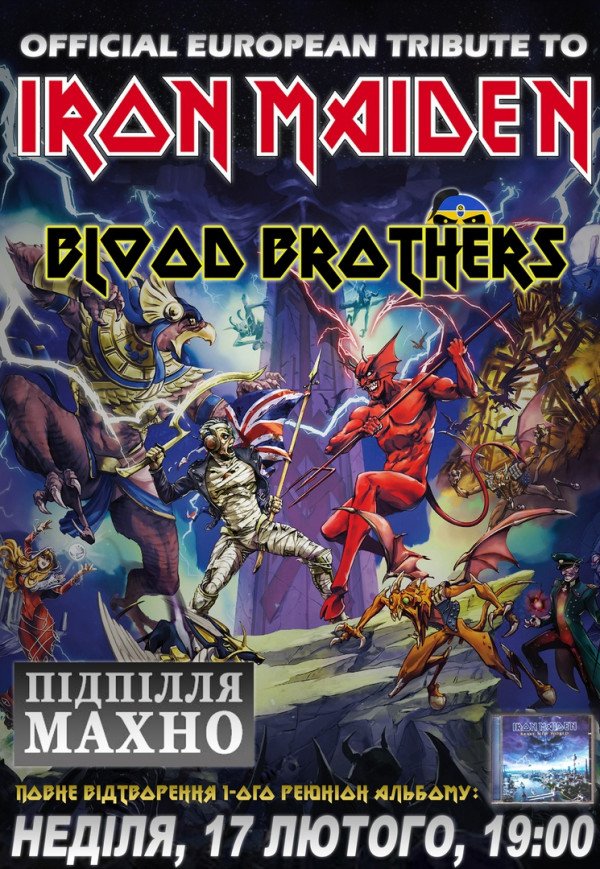 Tribute to Iron Maiden, Blood Brothers відбудеться 17 лютого 2019, 19:00, неділя в МахноПАБ. За допомогою сервісу internet-bilet.ua, Ви зможете з легкістю забронювати, замовити та купити квитки на концерт, спектакль, оперу, балет, майстер-класи, спортивні та дитячі заходи, що Вас цікавлять, оплативши їх найбільш зручним для Вас способом: через інтернет банківською карткою VISA/MasterCard, готівкою або кур'єром, якщо зробите замовлення квитка з доставкою.