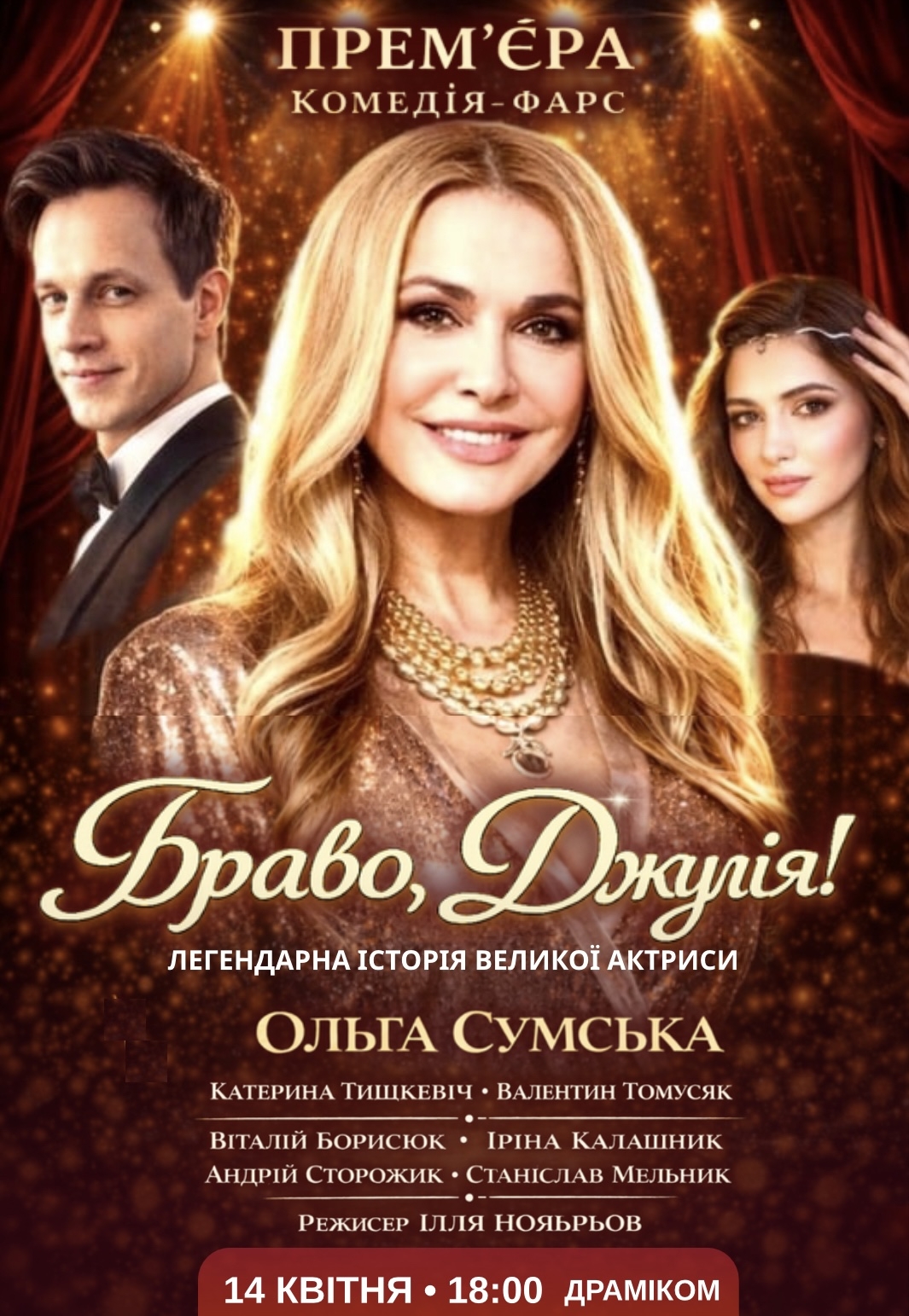 Вистава "Браво, Джуліє!". Прем'єра! відбудеться 14 квітня 2026, 18:00, вівторок в Дніпровський академічний театр драми та комедії. За допомогою сервісу internet-bilet.ua, Ви зможете з легкістю забронювати, замовити та купити квитки на концерт, спектакль, оперу, балет, майстер-класи, спортивні та дитячі заходи, що Вас цікавлять, оплативши їх найбільш зручним для Вас способом: через інтернет банківською карткою VISA/MasterCard, готівкою або кур'єром, якщо зробите замовлення квитка з доставкою.