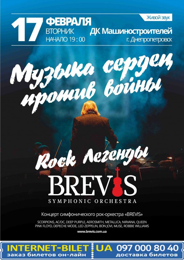 Симфонический оркестр "BREVIS" відбудеться 17 лютого 2015, 19:00, вівторок в ПК Машинобудівників. За допомогою сервісу internet-bilet.ua, Ви зможете з легкістю забронювати, замовити та купити квитки на концерт, спектакль, оперу, балет, майстер-класи, спортивні та дитячі заходи, що Вас цікавлять, оплативши їх найбільш зручним для Вас способом: через інтернет банківською карткою VISA/MasterCard, готівкою або кур'єром, якщо зробите замовлення квитка з доставкою.
