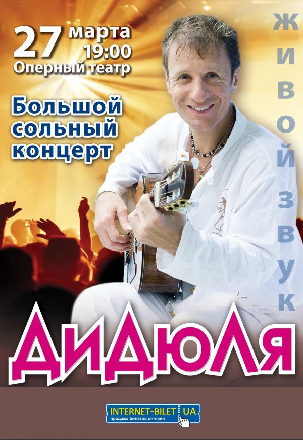 Дидюля відбудеться 27 березня 2017, 19:00, понеділок в Дніпровський академічний театр опери та балету. За допомогою сервісу internet-bilet.ua, Ви зможете з легкістю забронювати, замовити та купити квитки на концерт, спектакль, оперу, балет, майстер-класи, спортивні та дитячі заходи, що Вас цікавлять, оплативши їх найбільш зручним для Вас способом: через інтернет банківською карткою VISA/MasterCard, готівкою або кур'єром, якщо зробите замовлення квитка з доставкою.