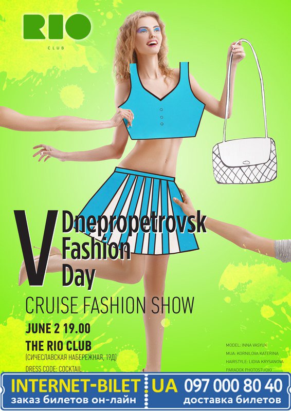 Dnepropetrovsk Fashion Day відбудеться 2 червня 2016, 19:00, четвер в RIO Сlub. За допомогою сервісу internet-bilet.ua, Ви зможете з легкістю забронювати, замовити та купити квитки на концерт, спектакль, оперу, балет, майстер-класи, спортивні та дитячі заходи, що Вас цікавлять, оплативши їх найбільш зручним для Вас способом: через інтернет банківською карткою VISA/MasterCard, готівкою або кур'єром, якщо зробите замовлення квитка з доставкою.