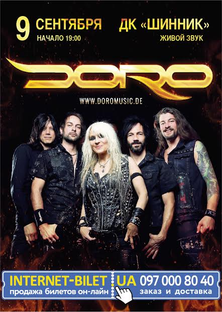DORO відбудеться 9 вересня 2016, 19:00, п’ятниця в Шинник-Арттериторія. За допомогою сервісу internet-bilet.ua, Ви зможете з легкістю забронювати, замовити та купити квитки на концерт, спектакль, оперу, балет, майстер-класи, спортивні та дитячі заходи, що Вас цікавлять, оплативши їх найбільш зручним для Вас способом: через інтернет банківською карткою VISA/MasterCard, готівкою або кур'єром, якщо зробите замовлення квитка з доставкою.