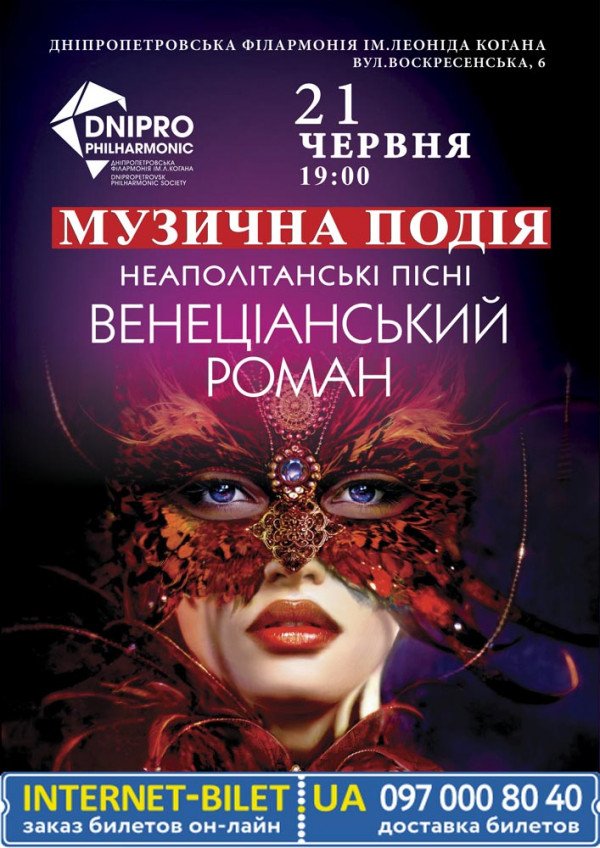 Музыкальное шоу «Венецианский роман» відбудеться 21 червня 2016, 19:00, вівторок в Дніпропетровська філармонія імені Л. Б. Когана. За допомогою сервісу internet-bilet.ua, Ви зможете з легкістю забронювати, замовити та купити квитки на концерт, спектакль, оперу, балет, майстер-класи, спортивні та дитячі заходи, що Вас цікавлять, оплативши їх найбільш зручним для Вас способом: через інтернет банківською карткою VISA/MasterCard, готівкою або кур'єром, якщо зробите замовлення квитка з доставкою.