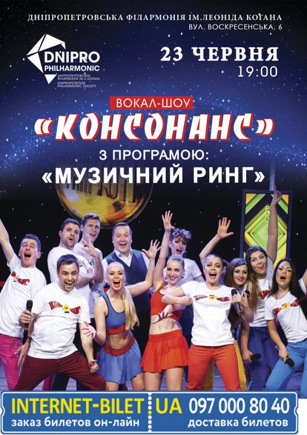 Вокал-шоу "Консонанс" відбудеться 23 червня 2016, 19:00, четвер в Дніпропетровська філармонія імені Л. Б. Когана. За допомогою сервісу internet-bilet.ua, Ви зможете з легкістю забронювати, замовити та купити квитки на концерт, спектакль, оперу, балет, майстер-класи, спортивні та дитячі заходи, що Вас цікавлять, оплативши їх найбільш зручним для Вас способом: через інтернет банківською карткою VISA/MasterCard, готівкою або кур'єром, якщо зробите замовлення квитка з доставкою.