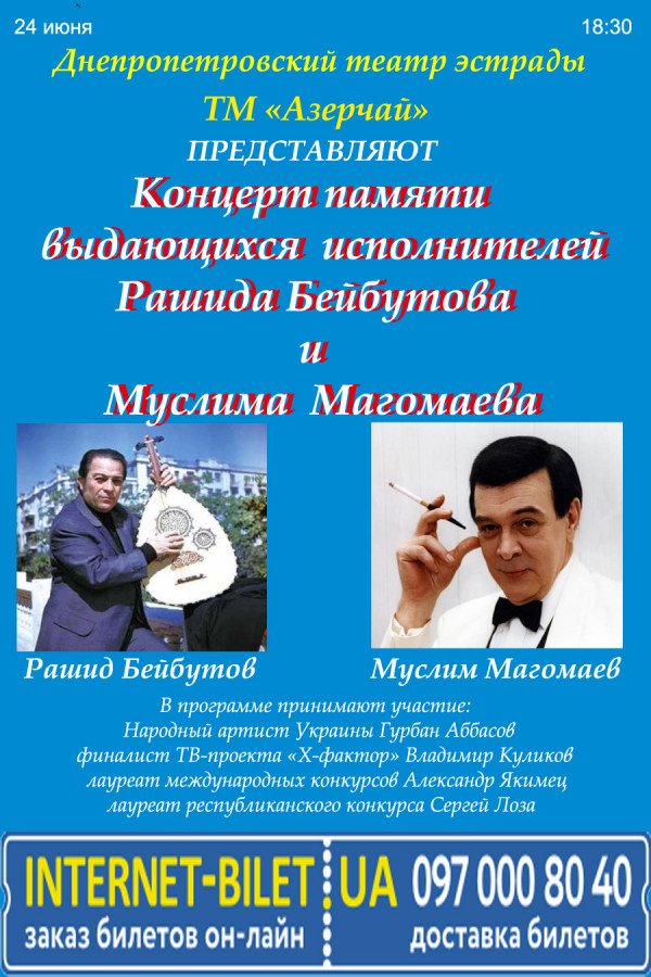 Концерт памяти Рашида Бейбутова и Муслима Магомаева відбудеться 24 червня 2016, 18:30, п’ятниця в Палац дітей та юнацтва. За допомогою сервісу internet-bilet.ua, Ви зможете з легкістю забронювати, замовити та купити квитки на концерт, спектакль, оперу, балет, майстер-класи, спортивні та дитячі заходи, що Вас цікавлять, оплативши їх найбільш зручним для Вас способом: через інтернет банківською карткою VISA/MasterCard, готівкою або кур'єром, якщо зробите замовлення квитка з доставкою.
